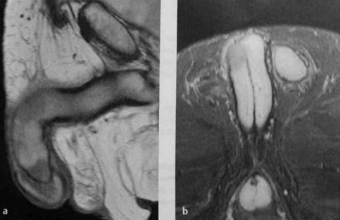 a, b Два метастаза переходноклеточного рака; один по дорсальной поверхности кавернозного тела в средней части полового члена, другой прилежит к головке полового члена. Сагиттальная Т1-взвешенная МРТ в режиме TSE (а) и аксиальная Т2-взвешенная МРТ в режиме IR (b). Метастазы можно определить по более низкой интенсивности сигнала по сравнению с кавернозными телами.